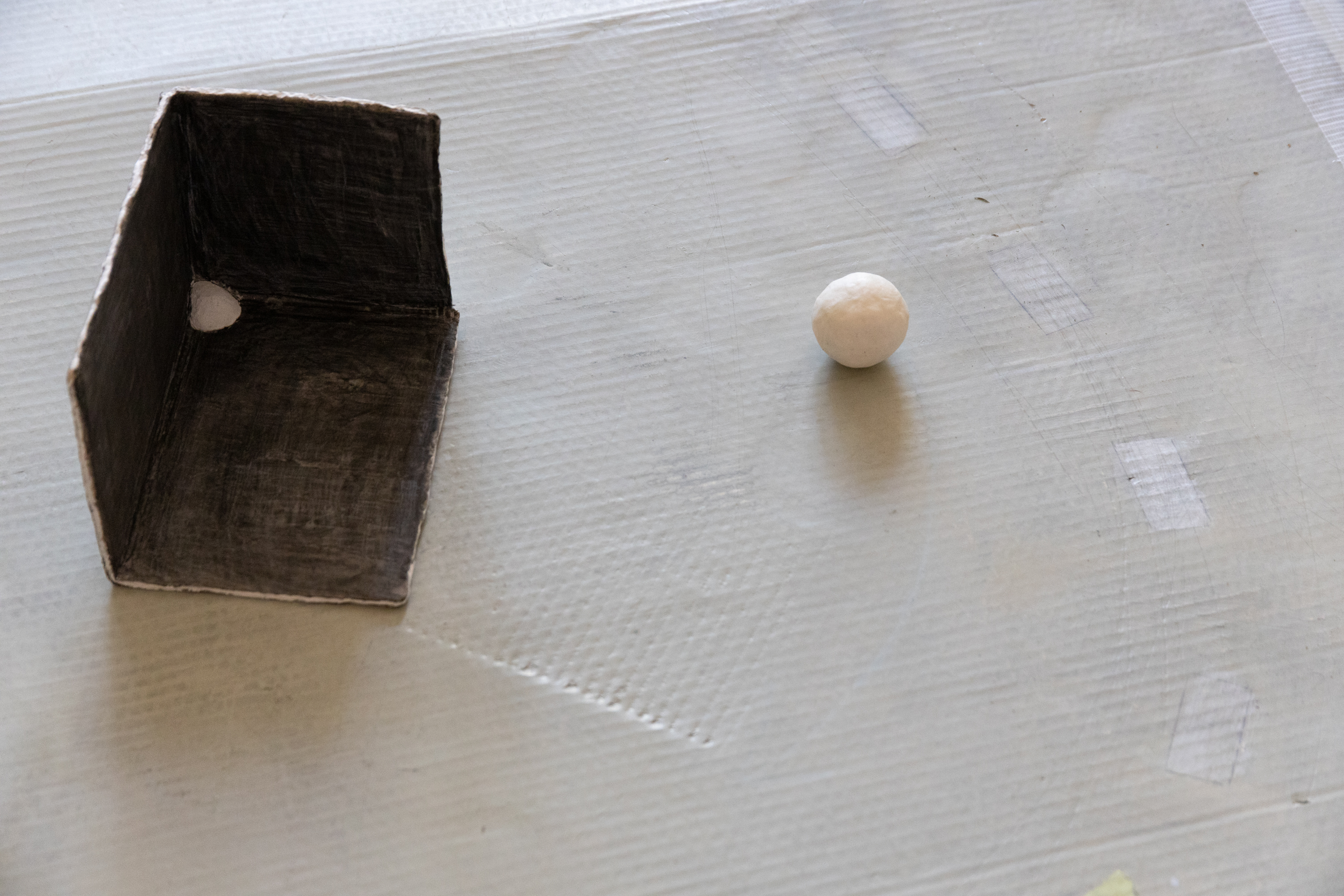 (Acrylic, oil and charcoal on cardboard and paper, handmade soap, graphite, dirt, tape and sound)